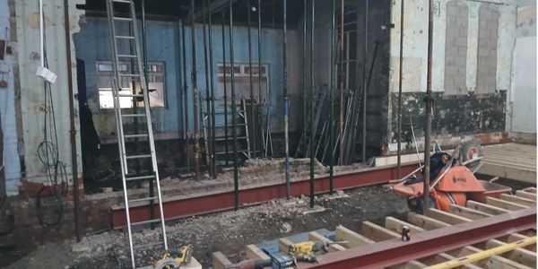 At last materials were being brought in and not out. The builders hard work was at now being seen in a positive way. The floor joists were almost complete and the steel beams ready to go in on the newly opened wall. The side wall of the dojo was out, exposing the old utility room and very small changing rooms. Soon to be the new spectator area.